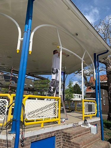 De afgelopen weken is er druk gewerkt aan het onderhoud van de muziektent, onder leiding van bestuurslid Bas Verweij met hulp van o.a. vrijwilliger Piet Jansen en bestuurslid Nico van Opijnen.