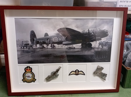 Daaronder het embleem van het 115e Squadron, enkele stukjes van het wrak en een zogenaamde wing, ontvangen na het behalen van het vliegbrevet.